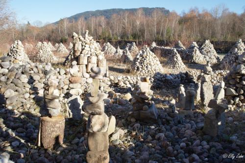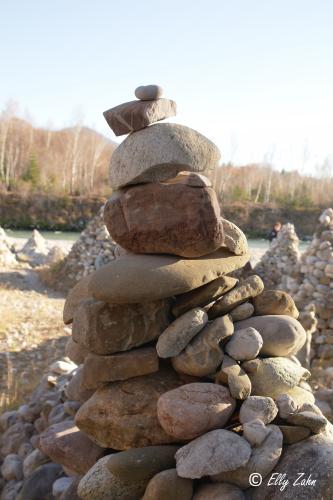 Wenn man von Bad Tölz nach Lenggries wandert oder von Lenggries nach Bad Tölz und irgendwann eine Abzweigung nimmt, die weg vom üblichen Pfad führt, dann kommt man zu den mehr oder weniger berühmten Steinpyramiden am Ufer der Isar, die eine beeindruckende Kulisse bilden.